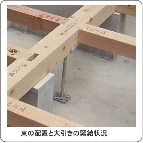 木製束の場合は、束と大引きとの間にスキマが生じていないか、かすがい等の金物で留められているかをチェックします。