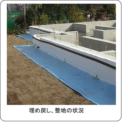 足場を組む前に、建物周りの埋め戻しと整地の状況を確認します。埋め戻し用の土の種類が適切か、ガラや廃材などが混ざっていないか、土が締まっているか、整地がきちんと行われていて凸凹が無いかをチェックします。